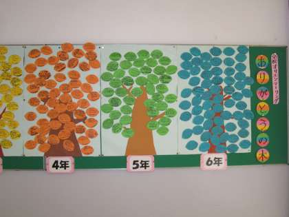 葉っぱ一枚一枚には、高学年への感謝のメッセージや下級生への優しい言葉かけなど、子ども達の温かい気持ちで満ちあふれています。玄関前廊下の掲示板に掲示していますので、ご来校の際はぜひご覧いただけたらと思います。