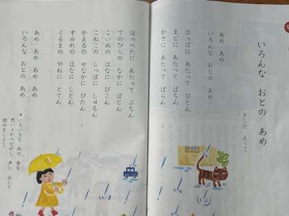 国語「いろんな おとの あめ」は雨の音を思い浮かべながら音読を楽しんでいます。