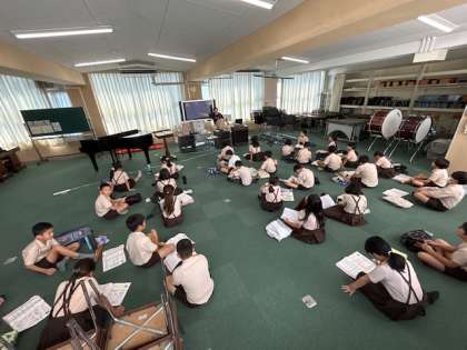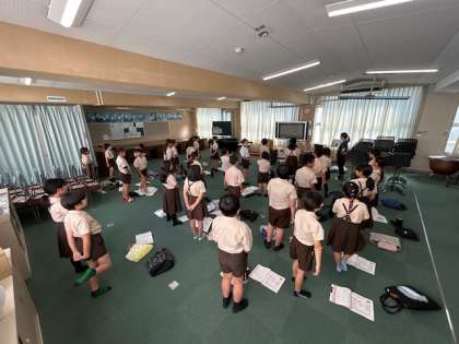 音楽「ゆかいに歩けば」は、旋律の特徴を活かしスタッカートに気を付けてリズムに乗って歌いました。