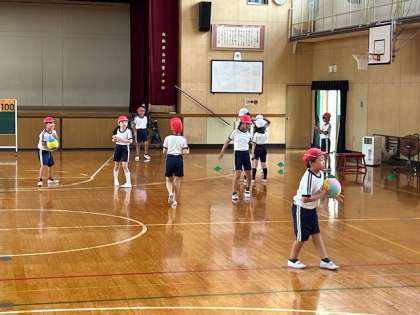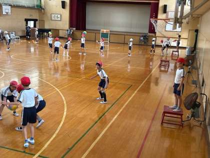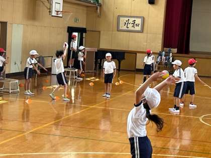 体育「ポートボール」では、各チームでパスやシュートの練習に取組み、ゲームに備えています。
