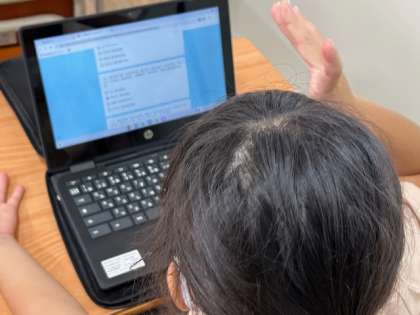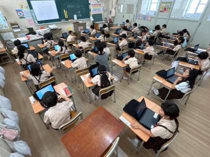 タブレットを使って学校生活に関するアンケートに答えています。