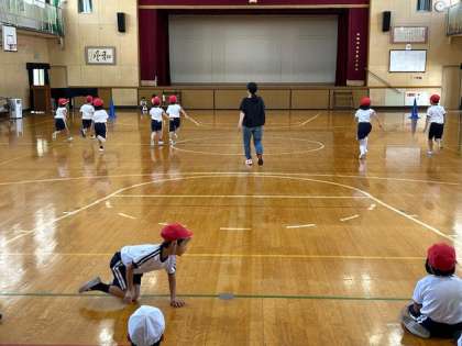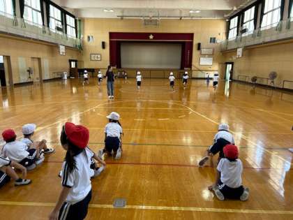 ?体育「かけっこ」は、コースを真っ直ぐ走る練習をして走る順番を確かめました。