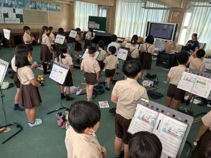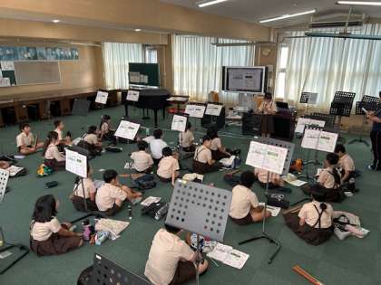 音楽「陽気な船長」は旋律の特徴に合わせてタンギングや息の使い方に気を付けて演奏しました。