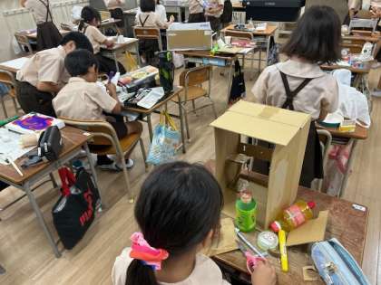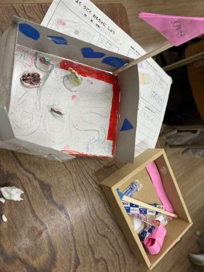 生活科「おもちゃづくり」では、工夫をしてもっとよく動くおもちゃを作っています。