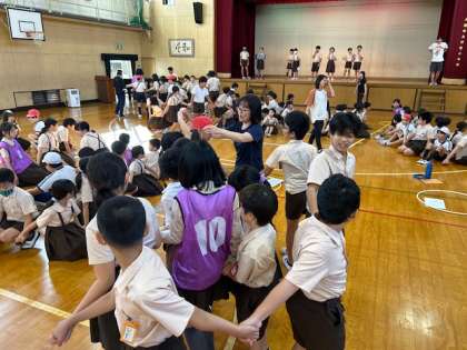 たてわり班で「人間知恵の輪」をしました。班の友だちが手を繋いで制限時間内に外側向きから内側向きに入れ替わります。