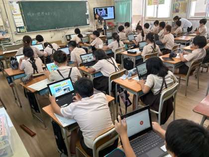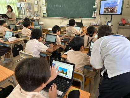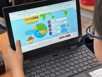 総合的読解力「どの国のどんなシンボルを作ろうかな?」では、タブレットを使って調べ学習を進めています。