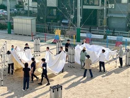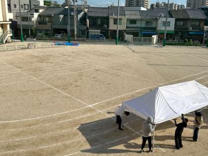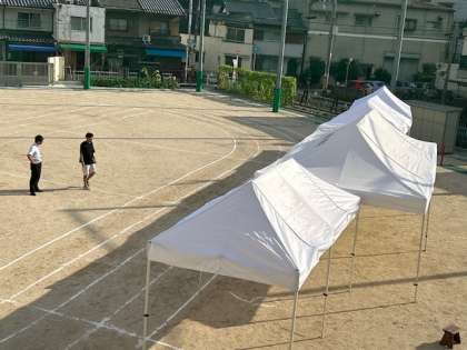 スポーツデーに向けて学習や活動で気持ちを切り替えています。テントを張り、放送機器を準備して明日からの練習に備えます。
