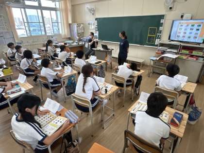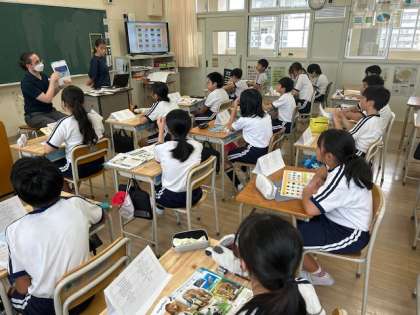 英語「What do the animals eat?」では、発音に気を付けながらスピーキングを進めています。