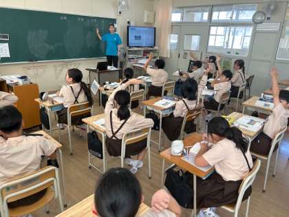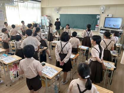 英語「who am I?」では、チャンツに合わせて動物のポーズを取ります。