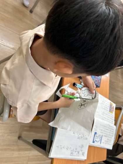 国語「サラダでげんき」は、アフリカゾウがした事をノートにまとめています。残り3つの登場人物も同様に文章を読み取ってまとめていきます。