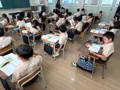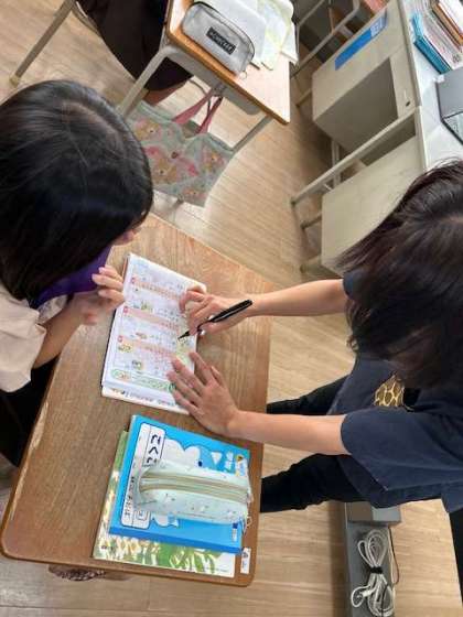 国語は漢字練習をしています。終わったら、「ニャーゴ」を読んで場面ごとに登場人物の様子を読み取っていきます。