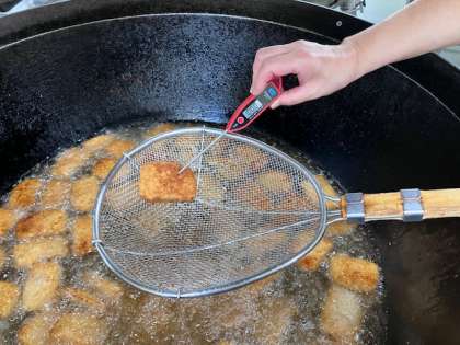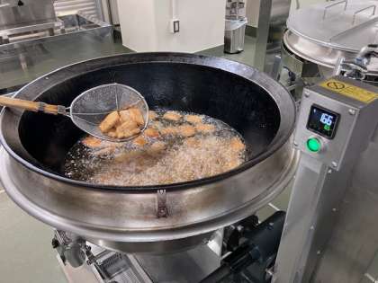 フライヤーでカツをサクサクに揚げます。中心温度を測りながらきちんと火が通っているかも確認しています。