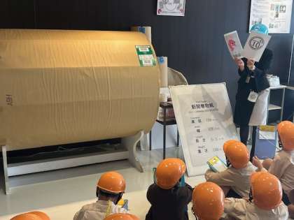 新聞巻取紙の前で海老江工場について説明がありました。