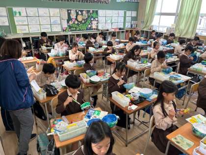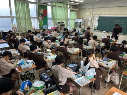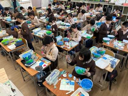 図工は作品展の立体を仕上げていきます。地球儀と中に入れたい物を仕上げています。