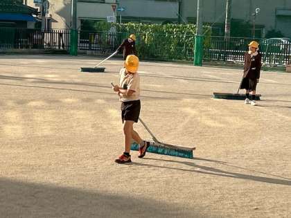 昨日の雨があがり、秋晴れの朝に健康運動委員会の児童が運動場整備をしています。