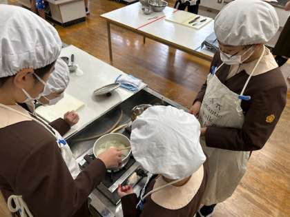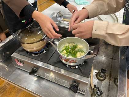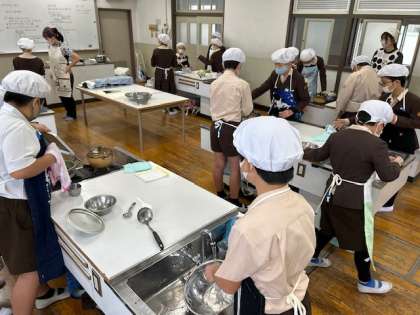 家庭科「ごはんと味噌汁」の調理実習では、班で協力して調理を進めています。出汁から取った味噌汁や炊き立てのご飯の試食が楽しみです。