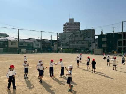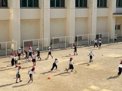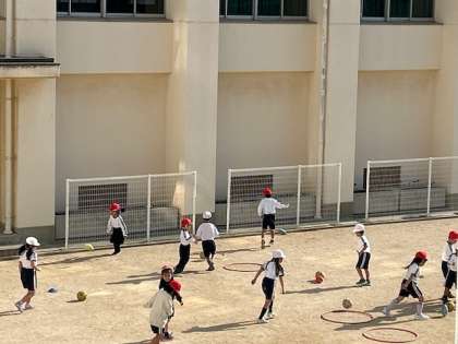 体育「ボールけり」は、ソフトサッカーボールやソフトラグビーボールをドリブルしてボールに慣れていきます。