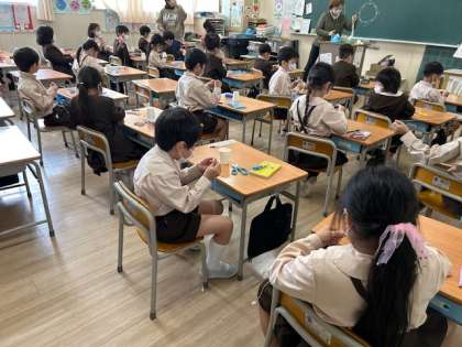 図工「くるくる まわそう」は、紙コップと凧糸を使っておもちゃを作っていきます。