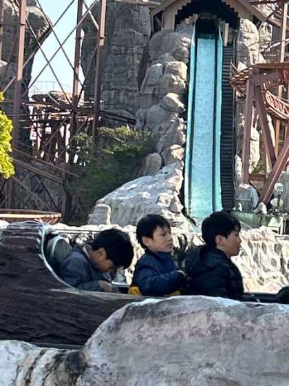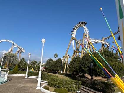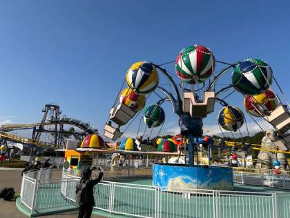 急流滑りやバイキング、ジェットコースター等の沢山のアトラクションに次々と乗り込んでいます。