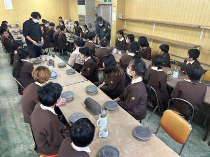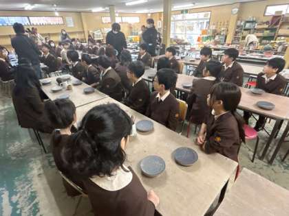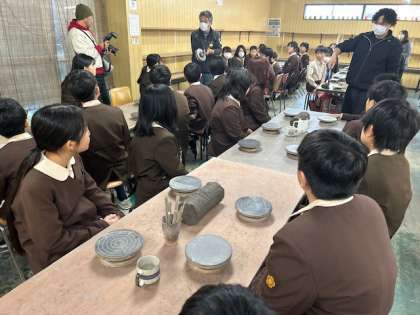 ロクロに土を載せ、空気を抜くために締め(叩き)ます。