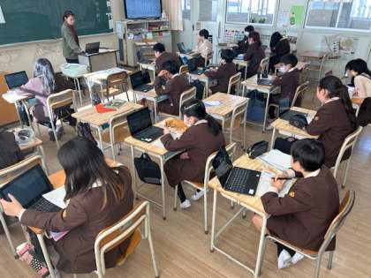 2学期迄の社会の学習内容についてタブレットで模擬テストをしています。