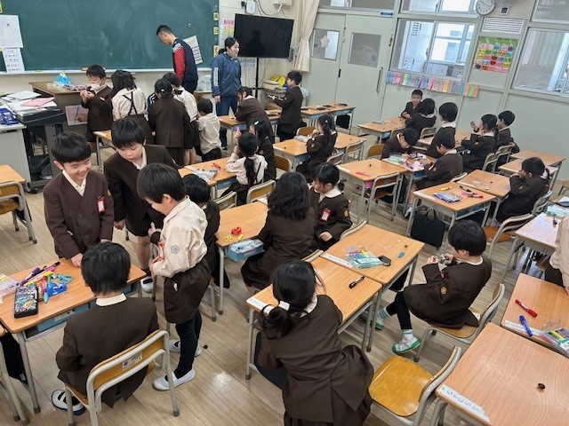 生活科「秋みつけ」では、どんぐりを使ってこまを作りました。友だちと楽しく活動しています。
