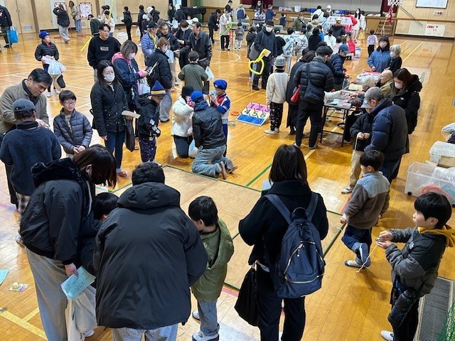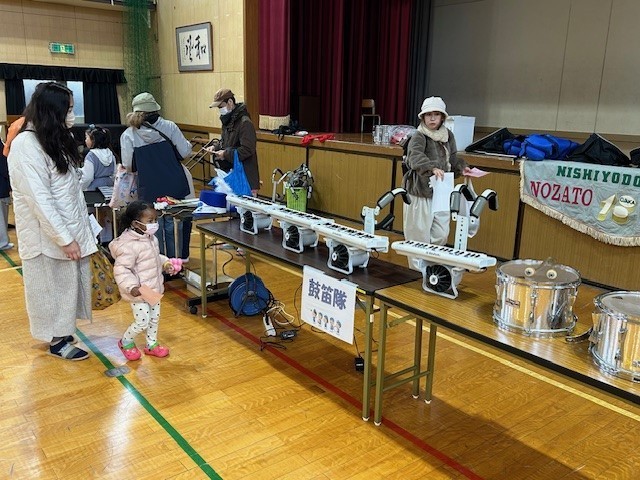 鼓笛隊の楽器に触れたり、駒回しや輪投げなどを体験しています。