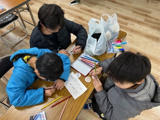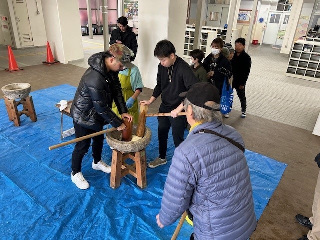 区役所の方に缶バッチを教えていただき、地域の方に餅つきを体験させていただきました。
