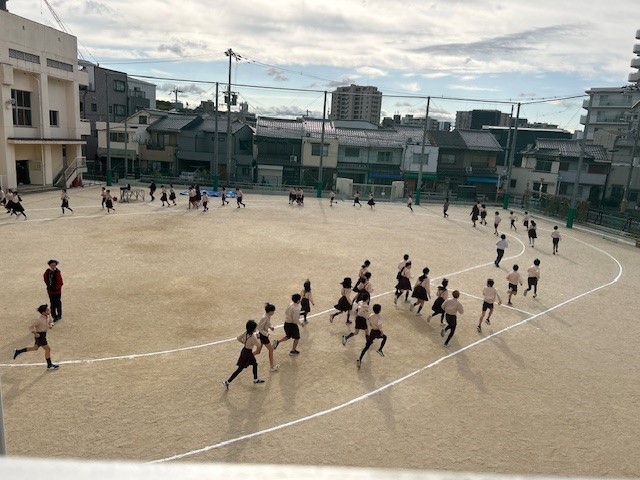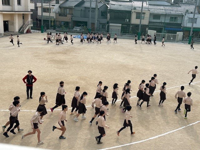 寒さに負けず、中休みに5・6年生が駆け足に取り組んでいます。準備運動を済ませたら自分のペースで7分間の持久走に挑戦します。