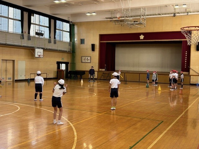 5年体育「Tボール」は打ったり守ったりする練習の後に試合形式で活動しました。