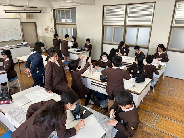 6年家庭科「雑巾づくり」は古タオルをリサイクルして雑巾を縫っていきます。