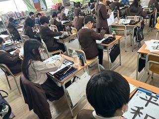 4年習字「平和」は文字のバランスを考えながら手本をよく見て集中して書きました。