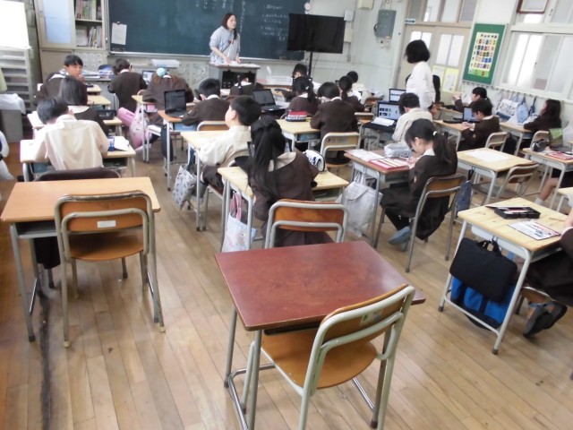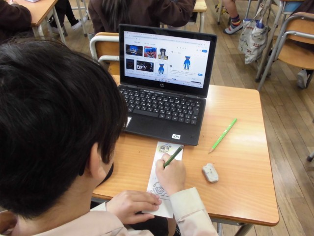 3年生は、日直の時に黒板横に掲示するための名札を作っていました。1年間使うものなので、丁寧に名前を書いていました。書き終えた児童から、余白や裏面に好きな絵を描いていきます。タブレットで調べて書いている児童もいました。