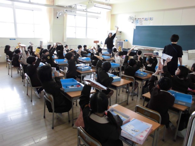 1年生は、お道具箱の中身をみんなで確認していました。先生が「色鉛筆」「はさみ」などを言って、一つひとつ上に挙げたあと、子どもたちが同じものを上に挙げていました。お道具箱の中身、全てそろっていたでしょうか。