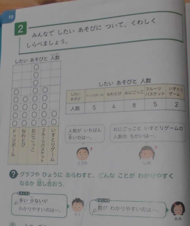 2年生は算数科「表と グラフ」を学習していました。次のような問題を見て、「表とグラフ、それぞれどんなことがわかりやすいのか?」を考えていました。グラフの方は、みんなのしたい遊びが鬼ごっこなのはすぐわかったようです。では、表では、何がわかりやすいのでしょうか。