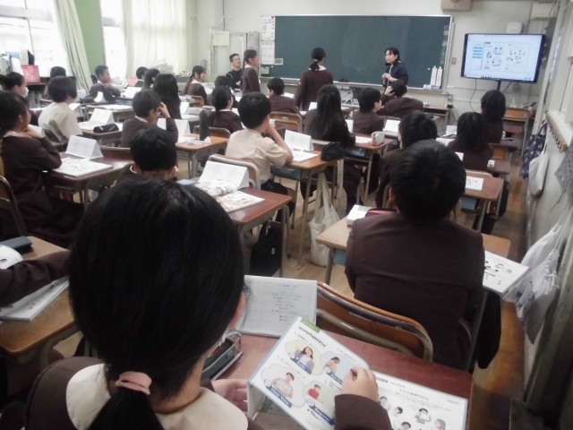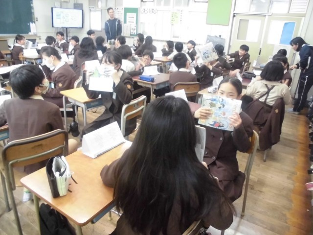 5年生は英語科「どんな気持ちかな」を学習していました。顔の半分を教科書で隠して、「Hi」と声を掛けます。お友だちが女気持ちで声をかけたのかを当てます。声をかけるほうは、どんなふうにしたら気持ちが伝わるのかを考えていました。