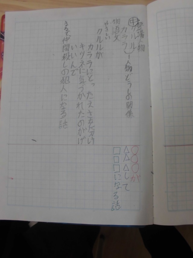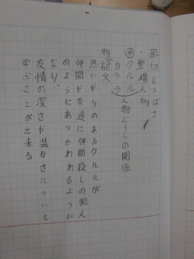 6年1組では国語科「風切るつばさ」を学習していました。物語を読んだ第1次の感想をノートに1文でまとめていました。文型は「〇〇〇が△△△して□□□になる話」と書けばいいようにヒントも与えられていました。まず自分の考えをもつことが大切です。