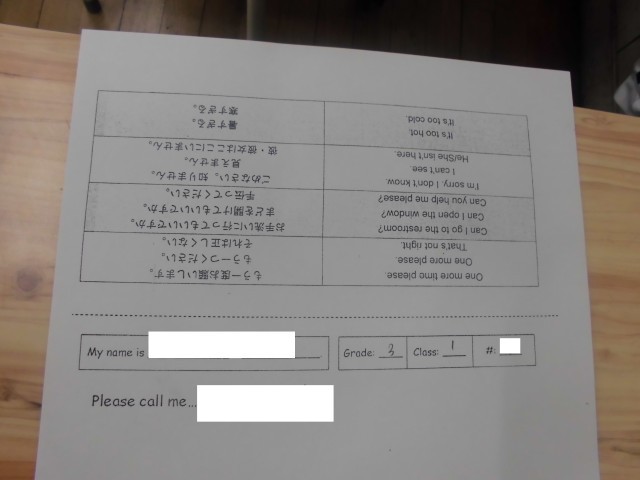 次は、3年生の子どもたちが先生に知ってもらう番です。「Please call me 〇〇.」「〇〇」の部分には自分が読んでほしい呼び名を伝えます。みんな何と書いたでしょうか。