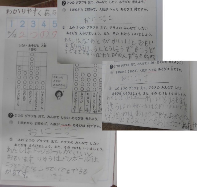 2年生は算数科「表とグラフ」を学習していました。2つのグラフを見て、クラスのみんながしたい遊びを選びます。そのあと、自分がそう考えた理由も書きます。子どもたちは一所懸命考えて、自分なりに意見をノートに書き表していました。
