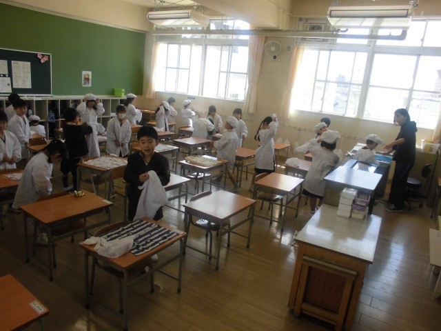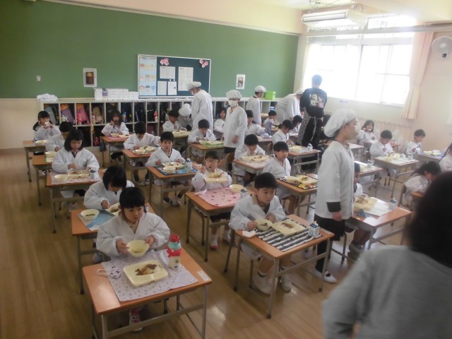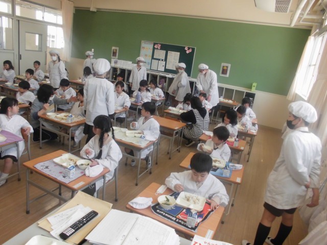 1年生にとって、小学校の給食が始まって4日目になります。1年生が給食に慣れるまでは、6年生が配膳を助けてくれます。今日も6年1組のお兄さん・お姉さんが来てくれました。食べている1年生に、6年生が優しく語りかけています。「おいしい?」「がんばって食べてね。」と話しているのでしょうか。