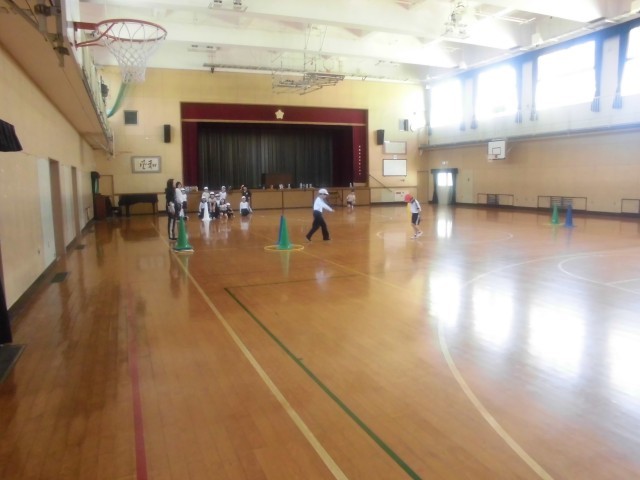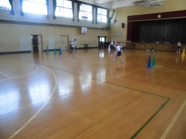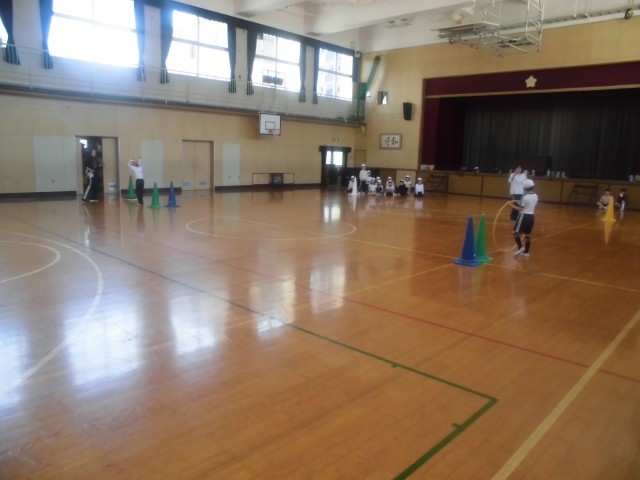 3年生は体育科の時間でした。正方形に置かれた三角コーンを一周します。最初の一辺を大股で歩き、次の一辺を小股で歩きました。その角に置かれたフラフープで縄跳びを3回します。次の一辺をスキップで進み、最後の一辺はかがんで走ります。一周すると体のいろいろな部分を使うので、いい運動だったようです。