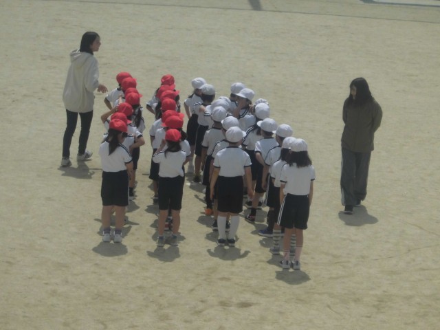 1年生は体育科の時間、赤白棒のかぶり方について話がありました。運動中落とさないようにゴムでとめます。