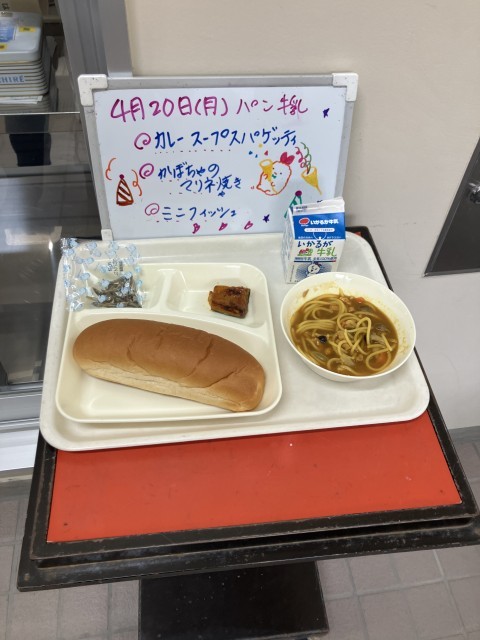 4月20日(月)の給食は、黒糖パン・牛乳・カレースープスパゲッティ・かぼちゃのマリネ焼き・ミニフィッシュです。