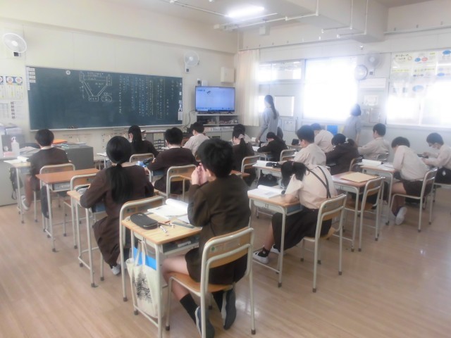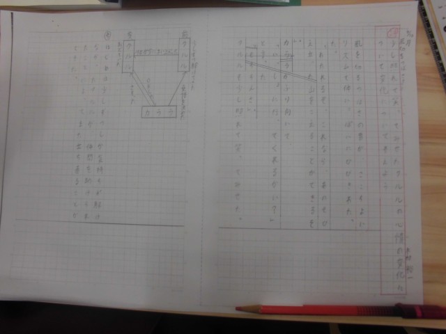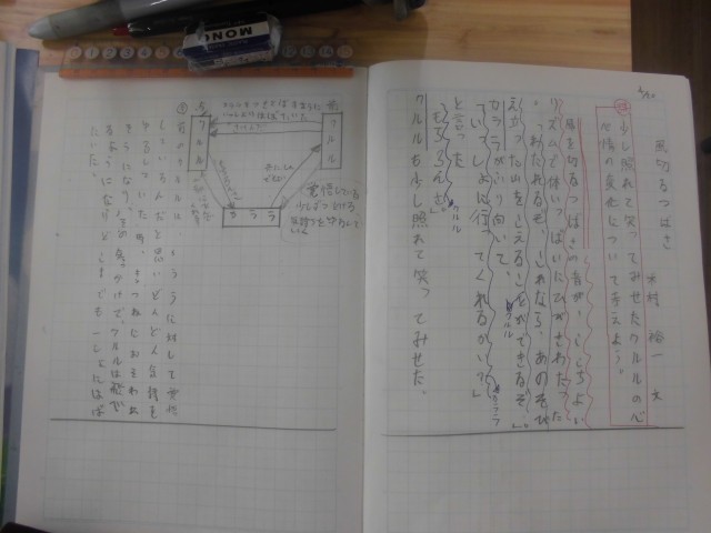 6年2組では国語科「風切るつばさ」を学習していました。前時に続いて、クルルの心情の変化に迫っていましたが、今回は「クルルは少し照れて笑ってみせた」の部分の表現にこだわって考えていました。じっくり時間をかけて、ノートに考えを書いていました。