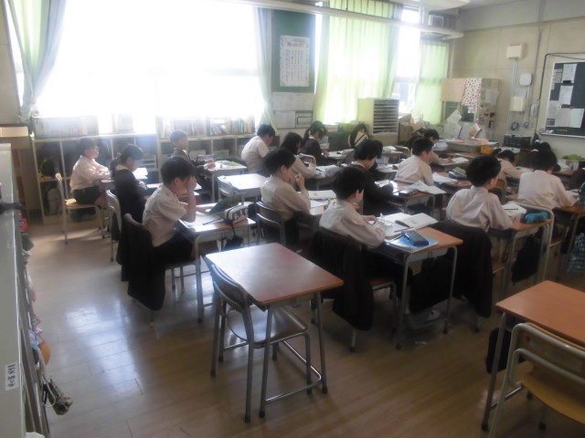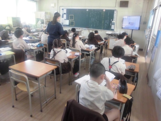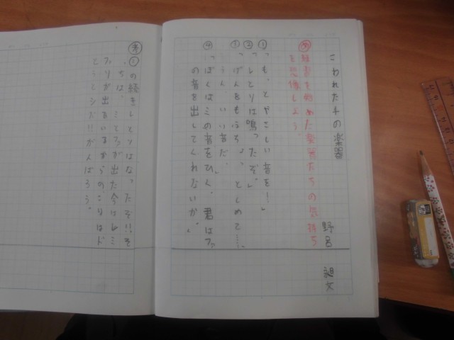 4年生は国語科「こわれた千の楽器」を学習していました。あきらめていた楽器たちが練習を始めた楽器たちの気持ちを考えていました。「もっとやさしい音を!」「レとソは鳴ったぞ!」など、4つの楽器が話した言葉のうち1つを選んで、続いてセリフを考えました。