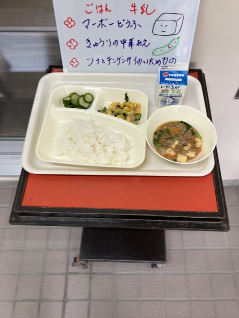 4月21日(火)の給食は、ごはん・牛乳・マーボー豆腐・きゅうりの中華和え・ツナとチンゲンサイの炒め物です。