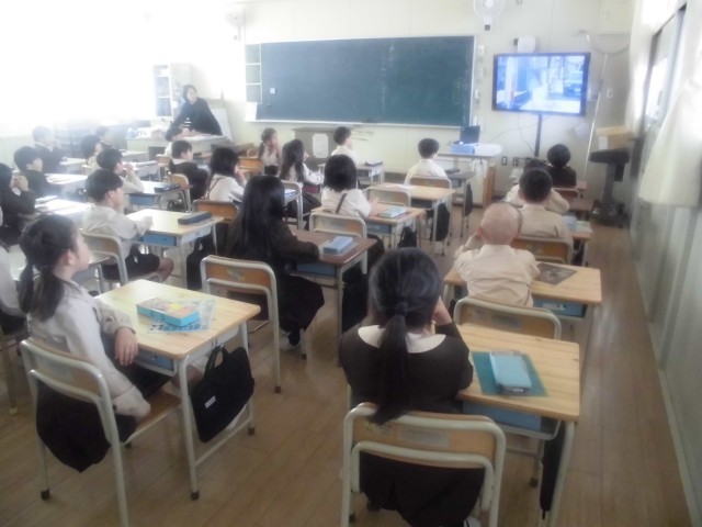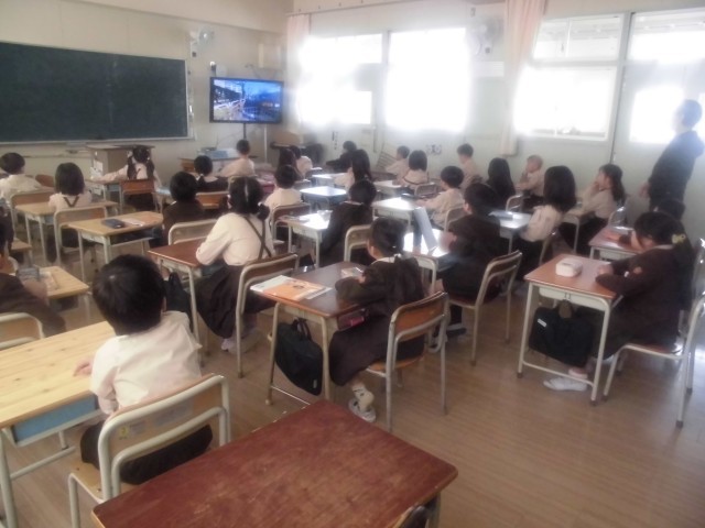 2年生は交通安全指導の学習をしていました。映像で、「歩道のある道・歩道のない道の歩き方」「信号のない横断歩道の渡り方・横断歩道のない車道の渡り方」「信号のある交差点の渡り方」を学びました。車を運転している人が常に歩行者に気を配れているかというと、必ずしもそうでないようです。もしものことを考えて行動することが大切なようです。