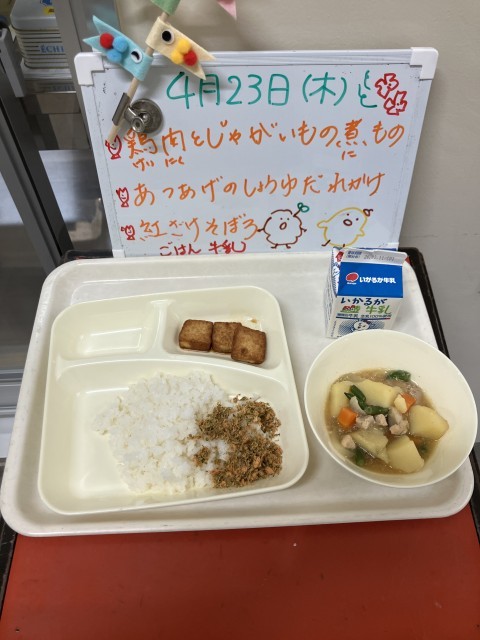4月23日(木)の給食は、ごはん・牛乳・鶏肉とジャガイモの煮物・厚揚げの醤油だれかけ・紅鮭そぼろです。