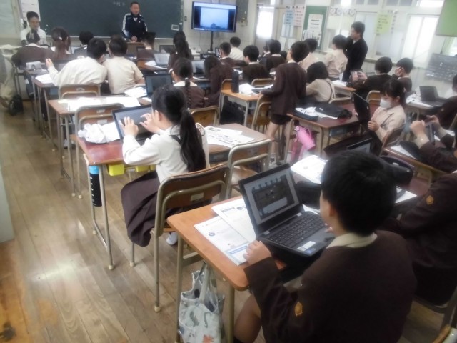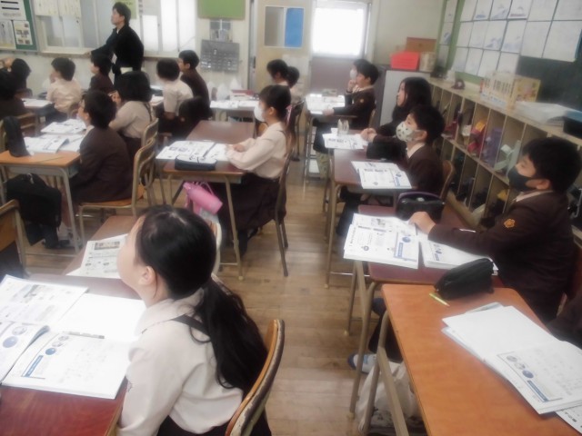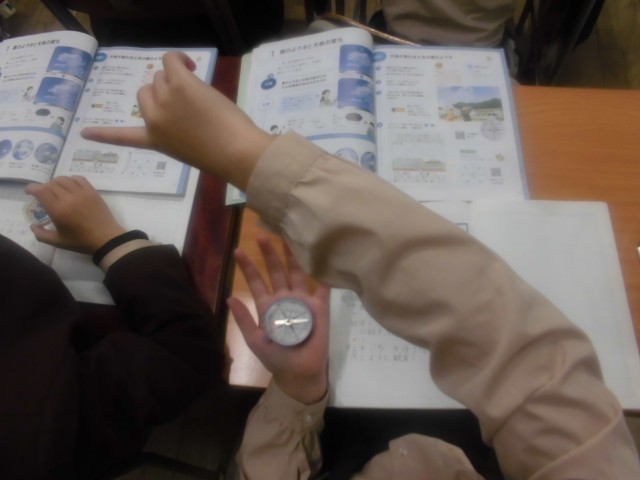 5年生は理科「雲と天気の変化」を学習していました。まず方位磁針の使い方を学びました。雲の観察をするときに、雲が動いた方位を調べます。