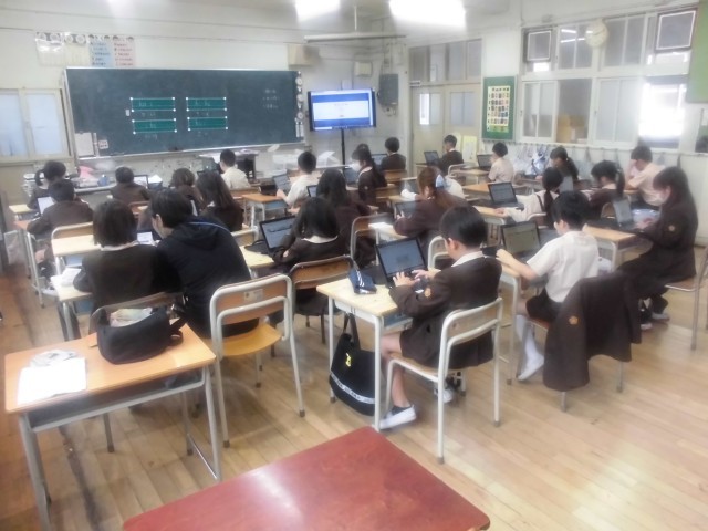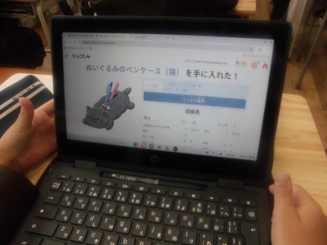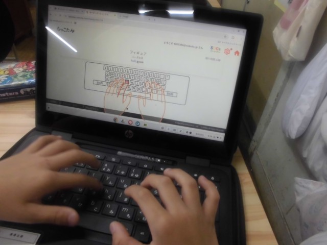 3年生は、タイピングソフト「らっこたん」を使って、キーボード入力の練習をしていました。画面に「a」「b」などアルファベットが出てきたら素早くキーボードで入力します。慣れたら「figure」などの単語も練習していました。ひらがな入力より効率のいいローマ字入力、早く慣れてほしいです。